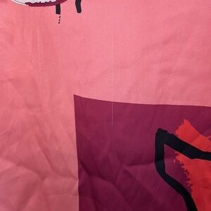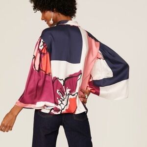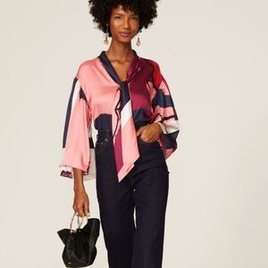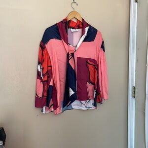 Stylish blouse with a tie-neck design. Features bold pink and navy patterns. Perfect for a chic look.