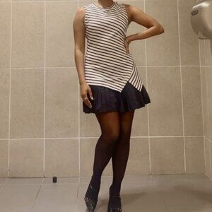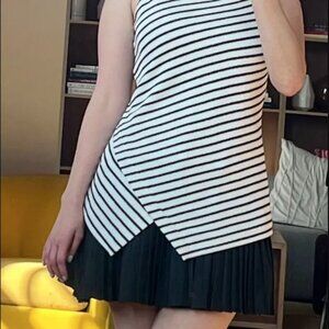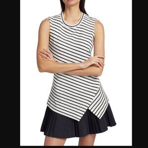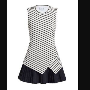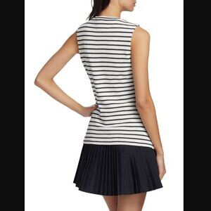 Effortless sophistication meets modern charm in the Regina Minidress by Tanya Taylor. This sleeveless, mixed-media design features a striped piqué knit bodice that flows into a solid pleated underlay skirt, creating a flattering A-line silhouette with a touch of playful movement. The diagonal stripe detailing adds visual interest, while the asymmetric hem enhances its contemporary appeal.