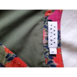 Good condition Tanya Taylor Rhett Falling Floral Print Silk Short Dress Size 2 Army Green Pink. 109% silk, 100% polyester lining. Stains on the lining skirt in the back as shown in photos; the stains are only on the inside lining and not visible when wearing the dress. Reflected in the asking price and can likely be removed by dry cleaning. Side zip closure.
