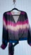 Chic V-neck blouse with vibrant pink and multicolored stripes. Long sleeves with a stylish fit. Perfect for a bold Surplice neckline Hook and eye closure Blouson sleeves Wrap around self-tie at waist 100% Silk (TAG WITH MATERIALS HAS BEEN REMOVED)