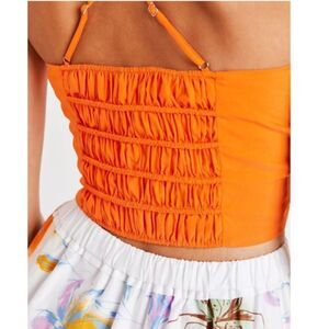 Designed in a lightweight cotton poplin, Cecil is a structural crop top in vibrant citrus orange. Featuring adjustable straps, smocking along the back bodice and a cutout beneath the bust, Cecil's tie can be adjusted for versatility of coverage. Style Cecil back to one of Tanya Taylor's Lara skirts or the Blake short for a polished daytime look.