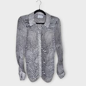tags: animal print blouse, zebra motif, semi sheer silk, statement print, bold texture, chic layering, luxury blouse, modern safari
