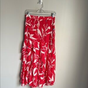 Red floral printed silk (100% Silk). Skirt. Hidden side zipper with hook-and-eye closure. Partially lined