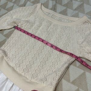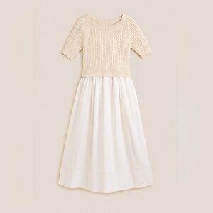 This dress features a charming two-texture design that combines cozy knitwear with crisp tailoring. The top is a cream-colored cable knit bodice with a scoop neckline and short sleeves, showcasing an intricate diamond and twist pattern for added texture. The fitted knit bodice transitions into a full, gathered white poplin skirt that falls to midi length, creating a soft, feminine silhouette with gentle volume. The overall look is elegant yet relaxed, perfect for spring outings, garden parties, or a chic daytime event.
