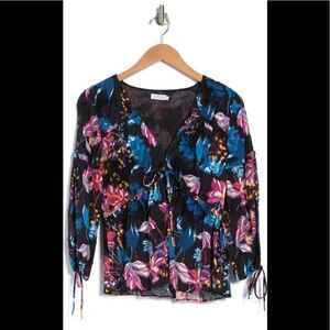 A gorgeous print and silk blend construction completes this chic blouse. - V-neck with front tie closure - 3/4 sleeves with tie cuffs - Floral print - Silk blend construction - Approx. 23" length (size S) - Imported