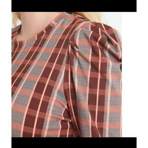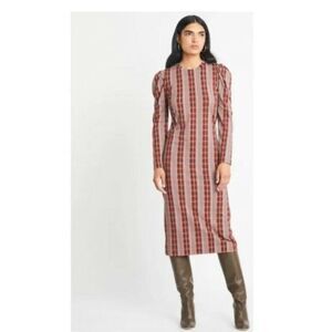 Elevate your wardrobe with the Tanya Taylor Nancy Dress, perfect for any occasion. This stunning dress features a plaid pattern in gray, burgundy, and pink hues, with puff sleeves and a crew neckline. The mid-axi dress is made from organic cotton and has a bodycon/sheath style with stretch for a comfortable fit.