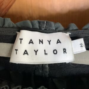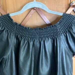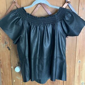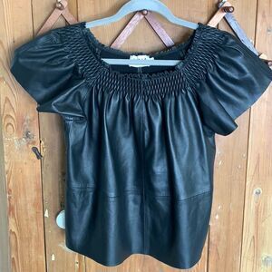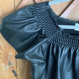 Tanya Taylor black lamb skin leather top with elastic smocking neckline and short cap sleeves. Block seams detail and no lining. I’m NEW condition