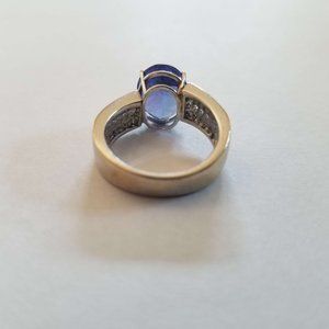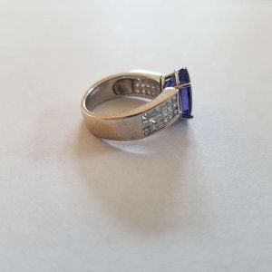 18k White Gold Tanzanite and Diamond Ring set with one center oval cut Tanzanite measuring at 11mm x 9mm weighing 5 carats, plus 36 invisible set Princess Cut Diamonds totaling 75 carats with Sl1 clarity and H-color