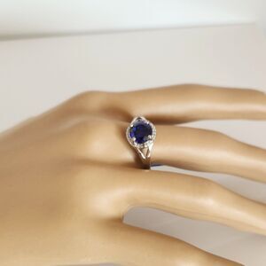 The simulated CZ tanzanite stone is set in a richly detailed halo ring setting.