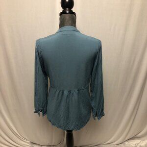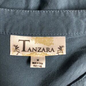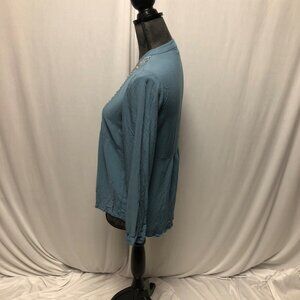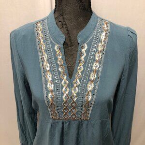 Tanzara Peasant Top Womens Size Medium Blue Bedazzled V Neck Boho Peasant Shirt