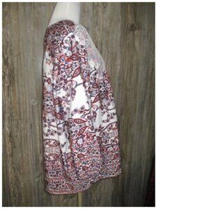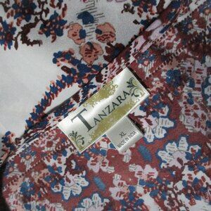 Womens size XL Tanzara multicolor print peasant like blouse top. It is 100% polyester and has elastic at the end of the sleeves and a tie by the neck. The tassels at the end of the tie have some light wear but overall the top is in good preowned condition. It may need to be ironed after shipping. Please see attached pictures for measurements. If you have any questions let me know.