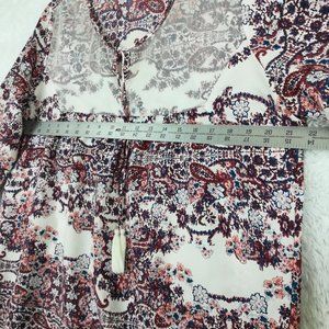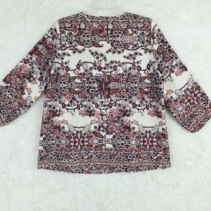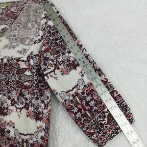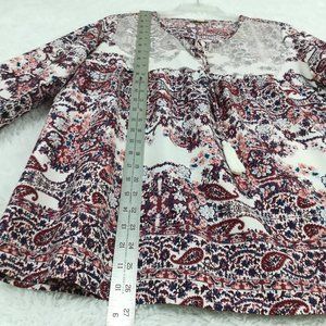 Tanzara Womens Blouse Paisley Print Mesh Overlay White 3/4 Sleeve Tie Neck L