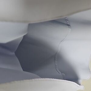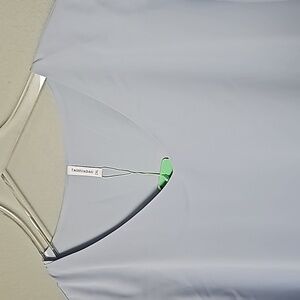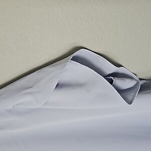 Powder blue color. Rounded V neck. Extra layer in the front. Lightweight fabric, doesn't stretch. Tulip sleeve. Great for the office.
