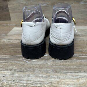 Elevate your shoe game with these stylish Taomengsi Mary Jane flats. The cap toe design and platform sole make for a comfortable fit, while the buckle closure ensures a secure fit. These flats come in a chic white and black color combination and are made of high-quality faux leather. The outsole is made of rubber for durability and traction. Perfect for any occasion, these flats are a must-have addition to any woman's shoe collection. Whether you're dressing up for a night out or running errands, these Taomengsi Mary Janes will complete any outfit. See picture for sizing and make these flats your go-to shoe choice today.