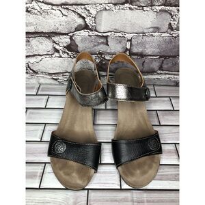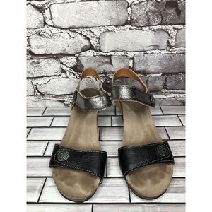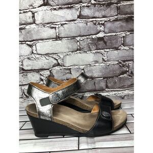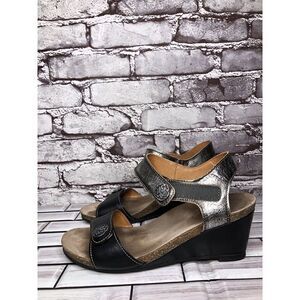Taos Carousel 2 Black Silver Metallic Leather Wedge Heel Sandals Women Sz 38EU