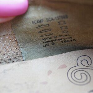Condition: Gently used. Some creasing and signs of wear on heel backs and strap areas. Tread in good condition. Clean insoles with decorative floral pattern.