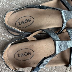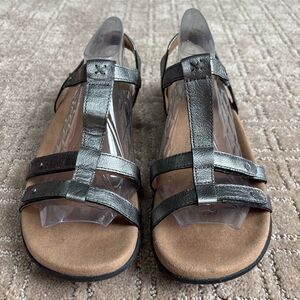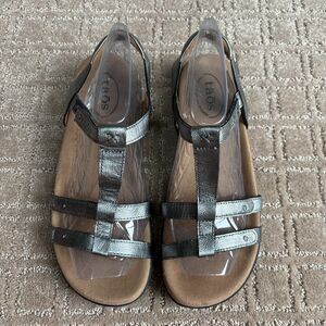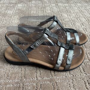 Taos Trophy Sandals Women's 9 Metallic Silver Comfort Ankle Strappy Casual EUC
