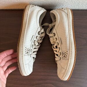 Keywords: Taos, white sneakers, leather sneakers, perforated sneakers, studded sneakers, casual shoes, comfort shoes, low top sneakers, athleisure, walking shoes, everyday shoes, women's sneakers