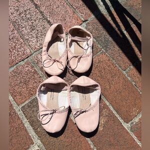 Black tap shoes for girls . Size 5 1/2 youth and the two smaller pairs are size 6 children. For some reason, the size 6 ballet shoes with the bow are slightly roomier than the other ballet shoes that are the same size. They are both the same length.