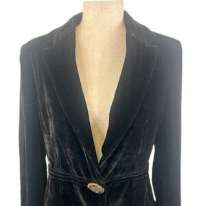 Keywords: velvet blazer, black jacket, womens blazer, size 10, career jacket, single button blazer, formal blazer, evening jacket, tape measure, rayon blend, classic blazer