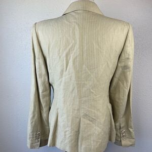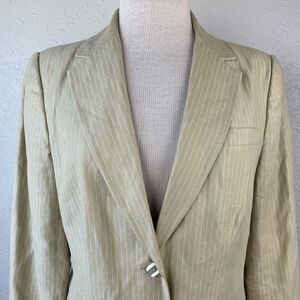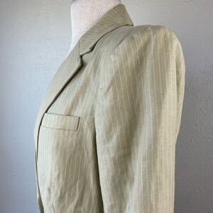 Beautiful lightly pinstriped linen jacket in excellent preowned condition. It measures 20 inches armpit to armpit laying flat, 17 inches at the waist, and 25 inches in length from shoulder to hem.