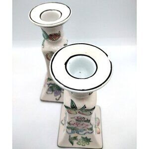 Taper Candle Holders Chinoiserie Hand Painted Vintage Floral Pastel Pair 8.3 In