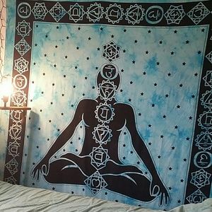 Blue and white tie dye tapestry got last month and hung up for a little bit before I got a new one. Queen size if not bigger. Chakra, girl meditating, has border around the whole thing.