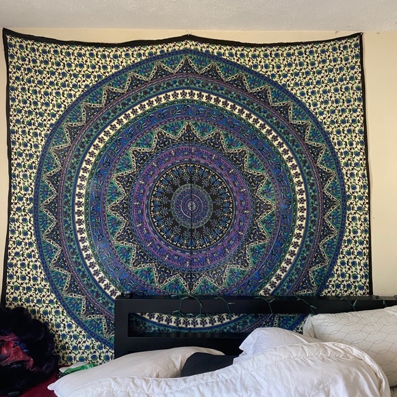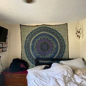 It’s huge! Will fit any wall from corner to corner it’s double sided and very well made it’s got a lot of really cool colors in it as well like purples greens and blues !
