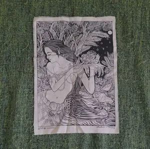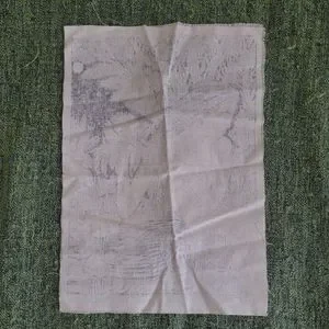 fabric tapestry with black ink art print left to right 11 in top to bottom 16 in.