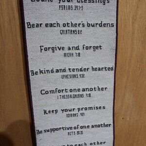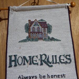 Large tapestry banner with Home Rules for a loving household. Great condition. Tassel on end. abut 8 inches wide, 42 inches long, then add about 3.5 inches for tassel. Hangs with cord and small wooden rod. Beige background. Rules like "always be honest" (407)