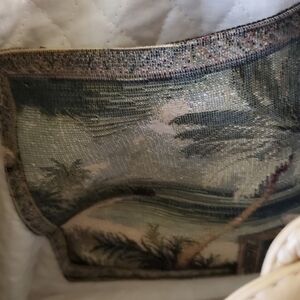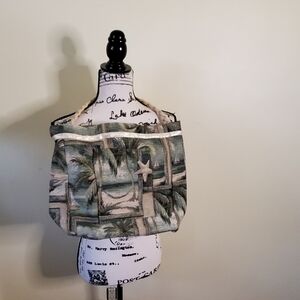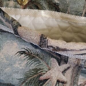 Tapestry Beach Palm Tree Star Fish Tote Bag. Like New Condition, Braided Cream Faux Leather Shoulder Strap, Double Strap Closure, Key Hook, Pockets inside and out. Shades of green and beige, Neutral. Great vacation Bag