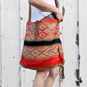Tribal print cross-body bag with leather closure and contrast canvas strap.