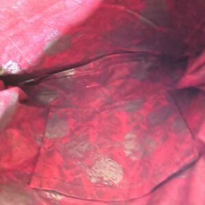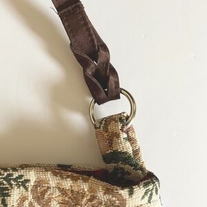 Vintage-inspired shoulder bag featuring a detailed tapestry floral pattern. This unique purse has a single shoulder strap, secured with metal rings and braided detailing. The bag closes with a decorative button and loop closure. The interior is lined with a red fabric and includes a small pocket for organization. This bag combines vintage charm with practical design.