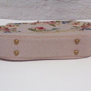 This handmade 1950s tapestry needlepoint purse features a beige color with a gold lining, giving it a luxurious and sophisticated look. The intricate design and Victorian style make it perfect for special occasions. The purse comes with a chain handle, adding a touch of elegance to the classic design. Ideal for adult unisex use, this original piece is a unique and stylish accessory for any outfit. Measures 8" high x 10" long x 2" wide.
