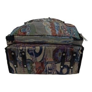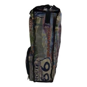 * This travel bag is tapestry with a Route 66 design. It has collapsible wheels that can be folded up for easy storage. It has a top zipper and hook & loop closure. It folds up for easy storage.