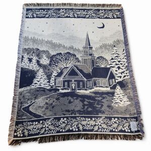 Tapestry throw blanket, Christmas church scene blanket, Mohawk Home throw, winter holiday blanket, blue and white woven throw, Christmas home décor, vintage-style tapestry, holiday cozy blanket, winter scene throw, festive home accents
