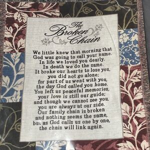 This beautiful woven blanket has a beautiful and meaningful poem about God and death. Very nice sentiment, perfect for a memorial gift. Brand new and sealed in the original packaging.
