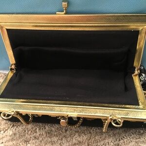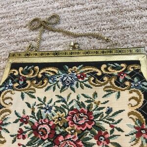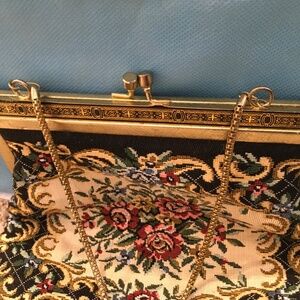 Lovely floral tapestry handbag with black border and mix of rose and blue flowers on cream color background. Made in China. Clean, black interior with no pockets.