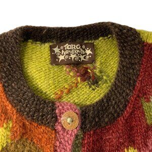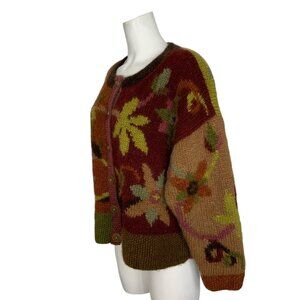 Tara Handknits Handspun Wool Cardigan Sweater L Floral Chunky Button Up Hippie