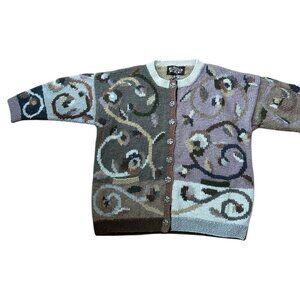 NO sizes on garment, runs around Misses Large, oversized fit. See photos for measurements.Really great knit. Ornate metal floral buttons.