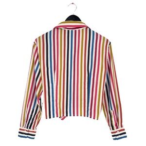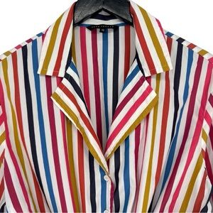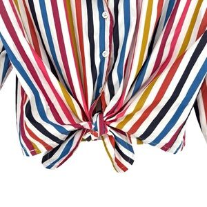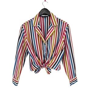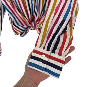 Tara Jarmon Long Sleeve Button Down Tie Waist Shirt 42 Colorful Rainbow Stripe