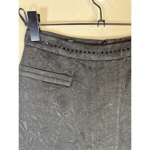 • Features: Front slit, textured floral jacquard pattern, faux welt pockets, beaded/eyelet waistband detail