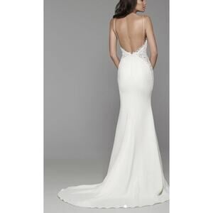 Enchanting bridal gown captures timeless romance with its dreamy details. Delicate lace adorns the bodice, cascading into a flattering V-neckline and continuing over the low, open back. The sleek, figure-hugging silhouette flows gracefully to the floor, creating an elegant train that whispers sophistication with every step. Perfect for a destination wedding, a rustic barn ceremony, or a formal ballroom affair.