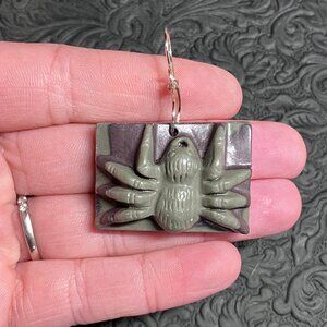 Beautiful hand carved green and brown ribbon jasper stone pendant of a tarantula spider, with a silver toned wire bail.