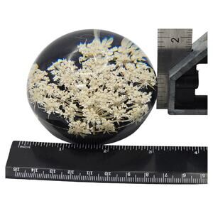 Handcrafted vintage lucite/acrylic resin paperweight by Tarax Infinity (Canada). Features a real dried Queen Anne’s Lace bloom preserved crystal clear inside the dome. Measures approx. 3.25" diameter, 1.75" tall, weight 7.6 oz. Excellent vintage condition with light surface wear. Brand: Tarax Infinity Products Ltd. Color: Clear lucite/acrylic with white flower on black base