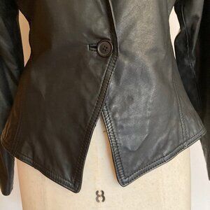 Vintage Tarazzia Internationale bomber/bat wing style jacket in jet black. Single button closure with extra matching button. Plunging neckline in 80s style with roomy chest pocket. Sits at the waist. Minor wear and brooch pin holes on the left lapel. Great vintage condition besides that with no rips, tears, holes or stains.