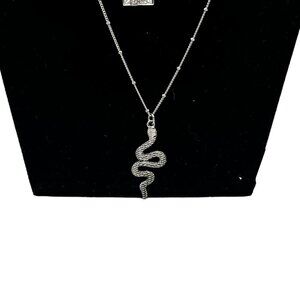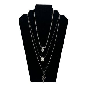 This layered necklace set features three distinct chains showcasing a skull, square, and snake charm. Crafted in silver-tone metal for a bold, stylish look.