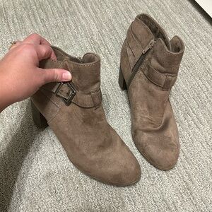 Beige faux suede with side zip buckle heels. Worn a handful of times.