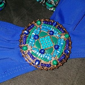 Adorabld blue and turquoise two piece with gold accents. Top is small, bottoms are medium, both have two ties and can be adjusted.