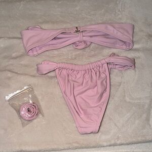 Stylish pink bandeau bikini set with matching bottoms. Perfect for the beach or pool.